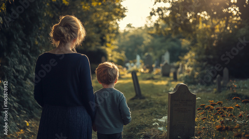 Matka z dzieckiem odwiedza grób bliskiego w cmentarnej scenerii.