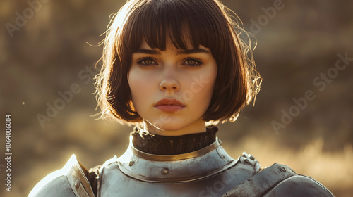 Młoda kobieta z krótkimi włosami prezentuje się w zbroi rycerskiej.