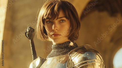 Młoda kobieta z krótkimi włosami prezentuje się w zbroi rycerskiej.