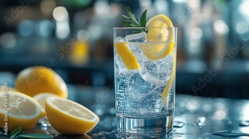Chilled vodka cocktail with lemon slices and rosemary in glass