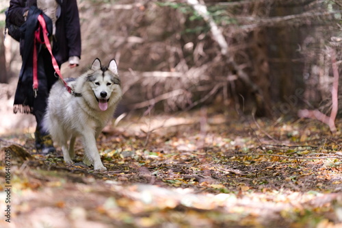 Pies husky na smyczy podczas spaceru leśną ścieżką