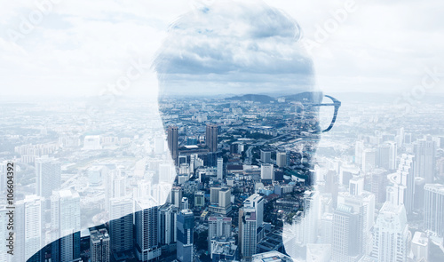 Photo of stylish bearded banker wearing trendy suit and looking city. Double exposure, panoramic view contemporary megalopolis background. Space for your business message. Wide
