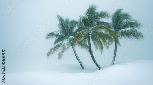 Tropical evergreen palm trees blanketed in white snow amidst a snowdrift during a blizzard highlighting unusual cold weather in typically warm regions Impacts of climate change are evident