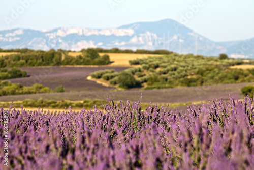 Prowansalskie pola lawendy z piękną górą w tle. Prowansja latem, fioletowe wzgórza