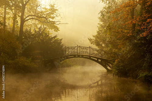 Park Pszczyna, jesienny mglisty krajobraz. Promienie słońca o poranku