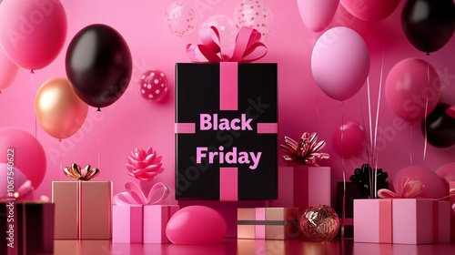Pudełka prezentowe, ozdobione balonami, tworzą wesoły widok z okazji Black Friday, przyciągając klientów do korzystania z wyjątkowych promocji.