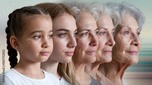 A series of women of different ages are shown in a row. Concept of the passage of time and the changes that occur as people age. Scene is contemplative and reflective