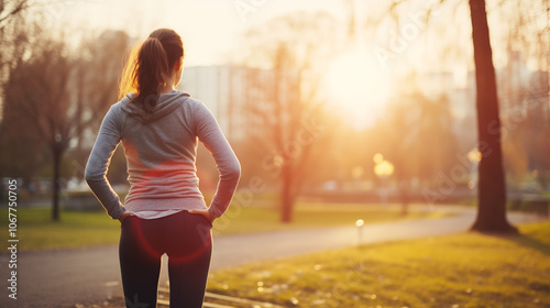 Woman Jogging in Park at Sunrise