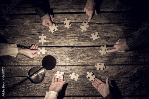 Six business partners placing puzzle pieces in a circle