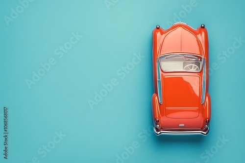 Orange retro toy car on light blue background, seen from above