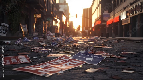Scattered election signs litter the street, a poignant reminder of the day's end.