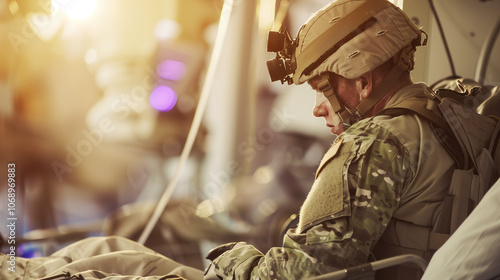 Soldier sitting on hospital bed, bandaged and determined, focused on recovery and resilience, amidst medical equipment.