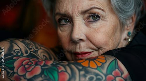 Dojrzała kobieta w biurze, której tatuaże opowiadają historię jej życia. Jej wyrazista twarz i eleganckie ubranie świadczą o harmonijnym połączeniu profesjonalizmu z indywidualnością.