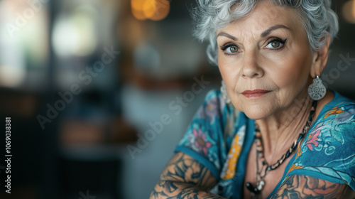 Dojrzała kobieta w biurze, której tatuaże opowiadają historię jej życia. Jej wyrazista twarz i eleganckie ubranie świadczą o harmonijnym połączeniu profesjonalizmu z indywidualnością.