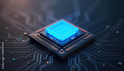 Glowing Blue Processor on Circuit Board: A close-up of a glowing blue processor on a circuit board, representing high-performance computing technology.