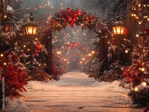 Świąteczny klimat w parku. Lampy i łuk z gałęzi sosny z czerwonymi kokardami