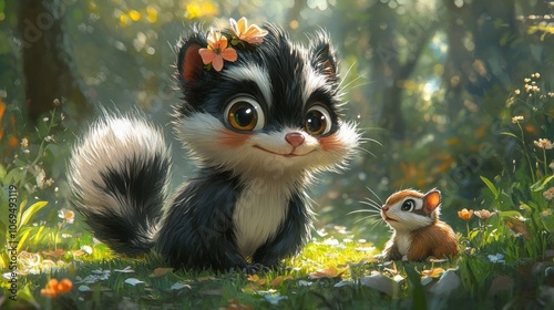 A cute cartoon skunk with a flower in its hair sits in a forest with a cute little squirrel.