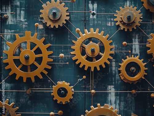 A close-up of a wall with a series of interlocked golden gears.