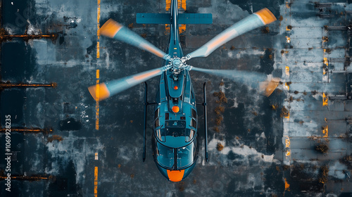 Helikopter unosi się w powietrzu, a ujęcie z góry ukazuje zarówno maszynę, jak i krajobraz poniżej.
