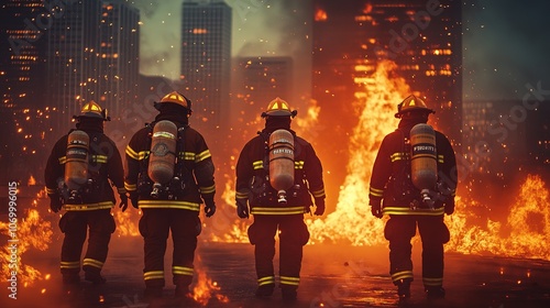 Abstract Marketing Background Featuring Futuristic Firefighting Operations in a Sci-Fi Setting, Showcasing Firefighters Executing Rescue Missions in Space Stations or Future Cities. This Design Highli