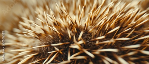 Close-up of spiky hedgehog spines, sharply focused, capturing the unique textures of this defensive creature.