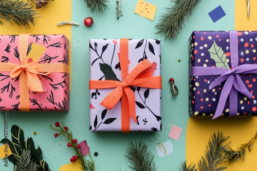 Quirky Christmas gift wrapping with wild patterns, bright ribbons, and unusual gift tags, set on a playful background