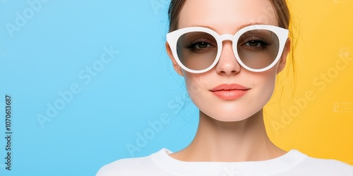 A stylish woman wears oversized sunglasses against a colorful background, showcasing a modern, chic look.