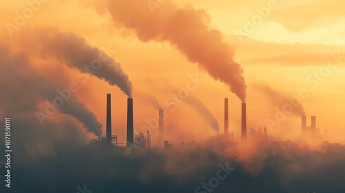 Fabryczne kominy emitujące gęsty dym, który zanurza się w smogu, ukazując poważne konsekwencje emisji dwutlenku węgla.