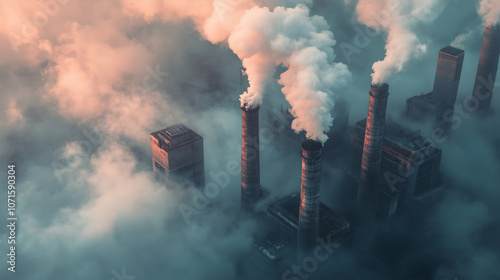 Fabryczne kominy emitujące gęsty dym, który zanurza się w smogu, ukazując poważne konsekwencje emisji dwutlenku węgla.