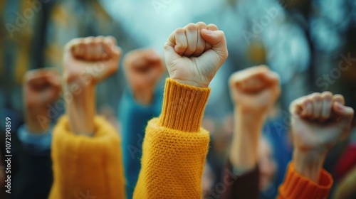 People of various ethnicities raising their fists in protest