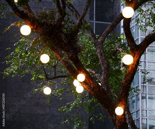 Oświetlone drzewo w parku. Intensywne oświetlenie zawieszone na drzewie w parku. Ciepłe oświetlenie, lampy zawieszone na gałęzi.