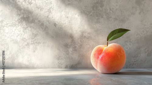 Dojrzała brzoskwinia, która wyróżnia się na tle gładkiej, nieozdobionej ściany, tworząc minimalistyczny obraz pełen harmonii.
