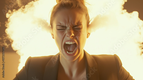 Wściekła młoda kobieta w odzieży biznesowej, z parą unoszącą się z jej uszu, co symbolizuje gniew i frustrację