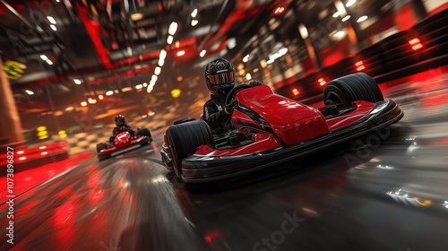 Thrilling Indoor Karting Race with Red Go-Karts on Dynamic Circuit with Blurred Background and Intense Motion