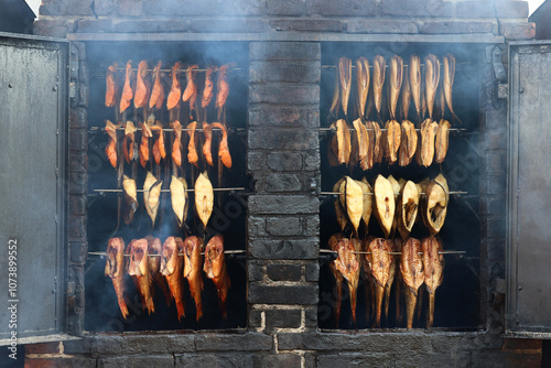 Wędzone ryby w wędzarni nad morzem.