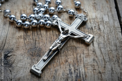 A crucifix and rosary on aged wooden surface