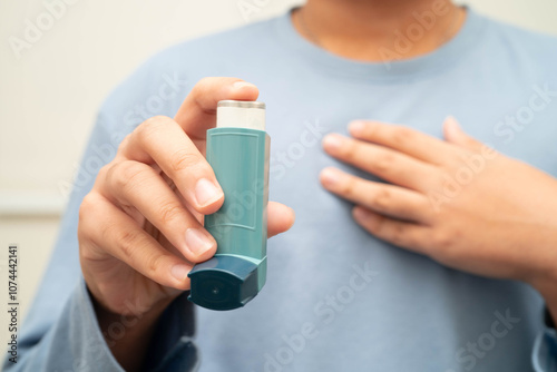 Asthma and chronic obstructive pulmonary disease COPD, Asian young man using metered dose inhaler MDI.