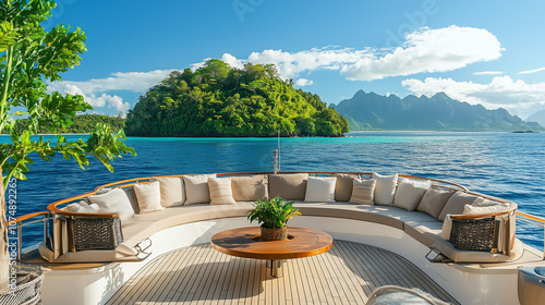 Widok z pokładu luksusowego jachtu, gdzie w tle pojawia się tropikalna wyspa.