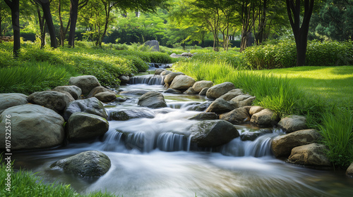 Spokojny widok na łagodny strumyk przepływający po gładkich kamieniach, otoczony soczyście zieloną trawą i drzewami, oddający cichą harmonię natury.