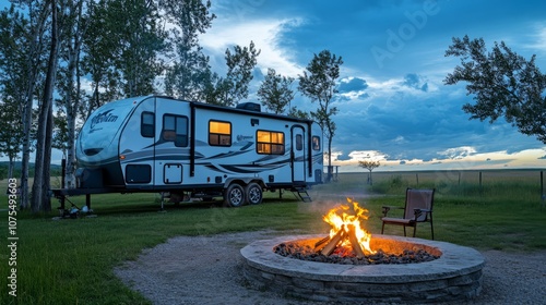Campfire Serenity: A travel trailer nestled in a serene meadow, bathed in the warm glow of a crackling fire, under a vast twilight sky.