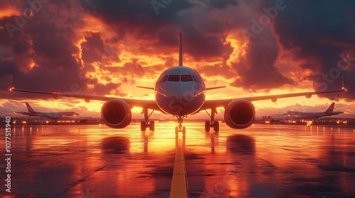 Passenger airplane waiting on the runway at sunset