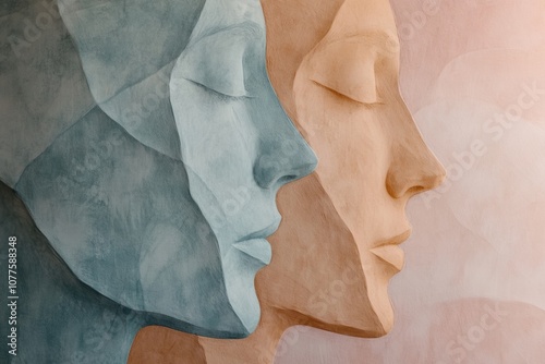 Two abstract silhouettes of faces in pastel hues reflect a deep sense of communication and empathy between individuals. Generative AI