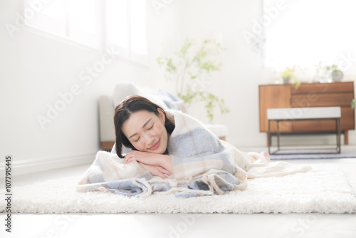 暖かい部屋でくつろぐ、寝る美しい女性のクローズアップの広角の秋冬の部屋のイメージ 広角