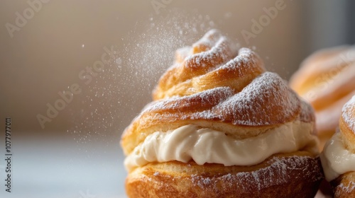 Minimalist flat lay of icelandic bolludagur cream pastry with powdered sugar for spring celebration