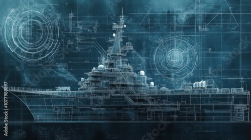 Photorealistic blueprint of a battleships radar and communication system, showing the array, transmitter, and antenna in technical detail