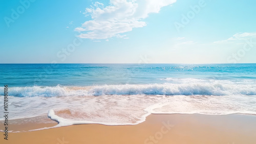 Waves gently lap against the sandy shore under a clear blue sky at noon