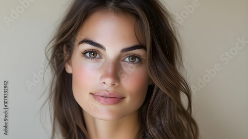 portret kobiety, zjawiskowa uroda, profesjonalna fotografia, elegancja, reklama kosmetyków, piękna kobieta, subtelny makijaż, portret na gładkim tle, kobiecy urok, profesjonalne oświetlenie, fotografi