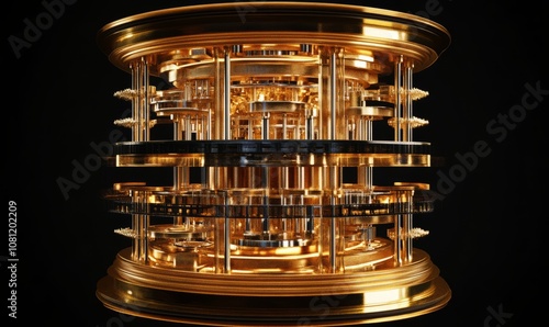 Quantum computer isolated on black. Golden gear, quantum computing, quantum cryptography, steampunk, Q bits, parallel computing