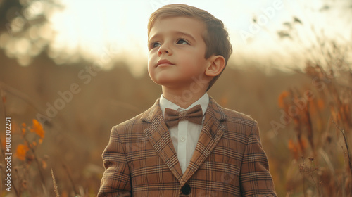 Uroczy chłopiec w modnym, dobrze dopasowanym garniturze, stojący na tle natury.