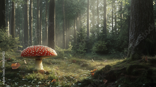 W leśnej polanie oświetlonej słońcem, czerwony grzyb z białymi kropkami emanuje swoim pięknem na tle zieleni i naturalnych tonów lasu.
